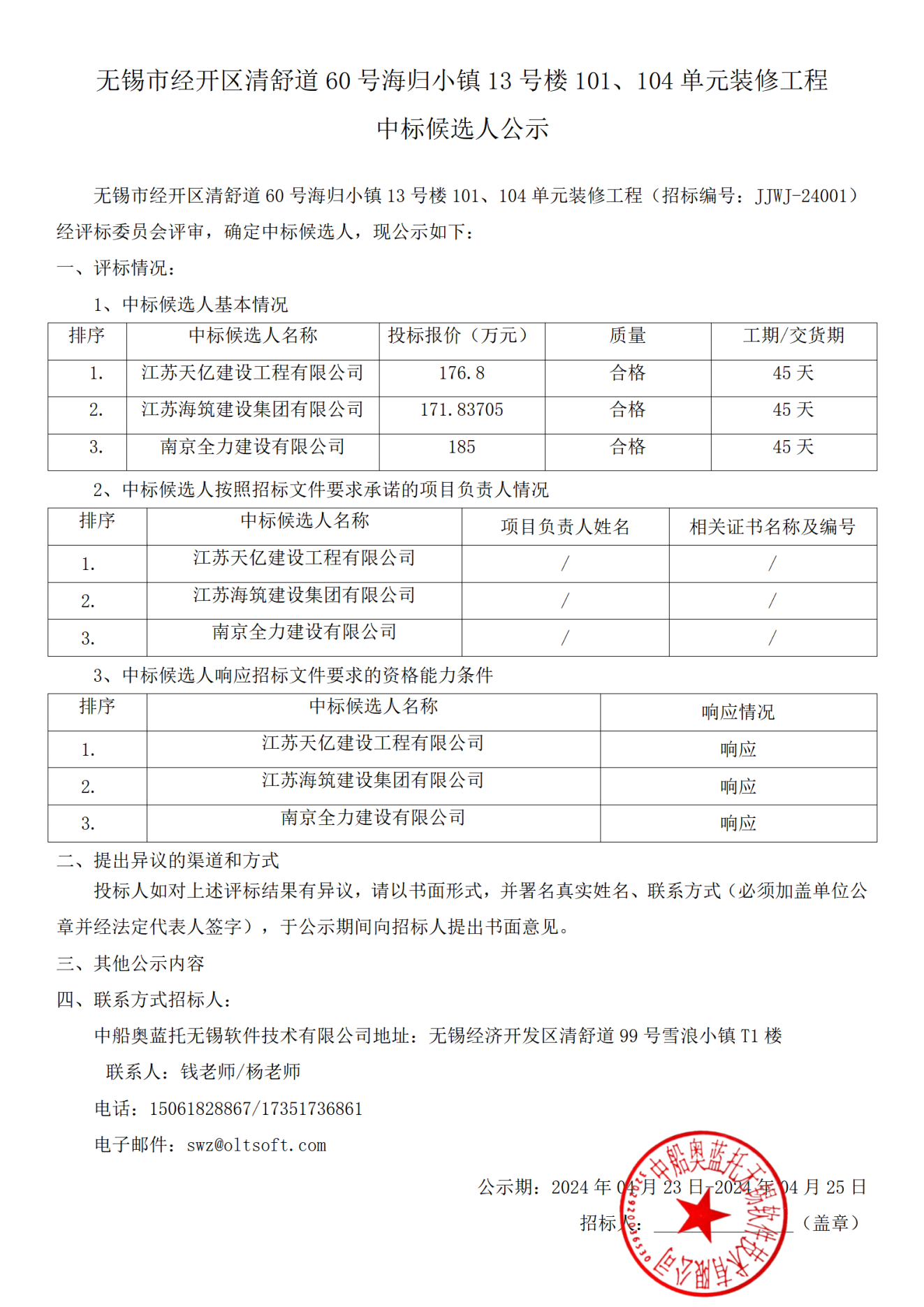 无锡市经开区清舒道60号海归小镇13号楼101、104单元装修工程 中标候选人公示